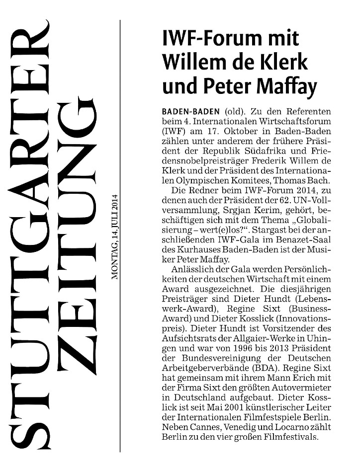 Zu den Referenten beim 4. Internationalen Wirtschaftsforum (IWF) am 17. Oktober in Baden-Baden zählen unter anderem der frühere Präsident der Republik Südafrika ...